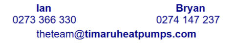 Timaru Heatpumps & Servicing isn't a big operation, we're two local guys, Ian Westwell and Bryan Robinson, who are proud to bring our years of expertise and dedication to providing outstanding service to the entire South Canterbury region, including Timaru, Waimate, Geraldine, Temuka, and surrounding areas.